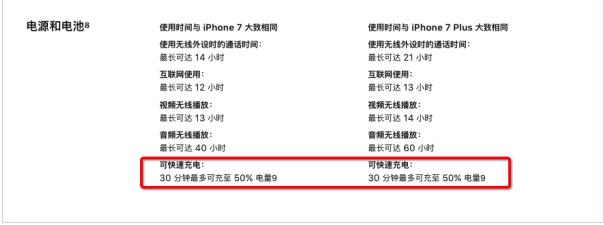 蘋果并沒有在發布會上提及新款iPhone支持快充,當然還是有眼尖的網友在官方頁面注意到蘋果的描述:可快速充電:30分鐘最多可充至50%電量。