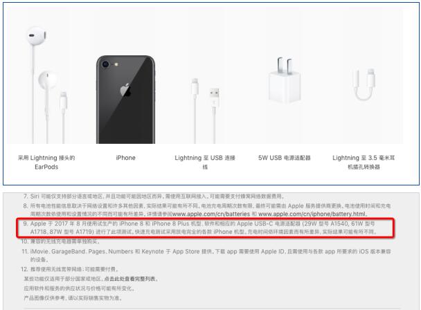 蘋果還是這么高冷,盡管之前備受吐槽沒有快充功能,這一次有了快充,居然也絲毫不提,實際上,從最后的注釋中可以發現,盡管具備了快充功能,但隨機附送的充電器卻不支持快充,仍舊是祖傳5W充電器。在備注中,用于測試快充功能的充電器為29W的A1540、61W的A1718,87W的A1719,均為iPad Pro、13寸和15寸Macbook Pro的電源適配器,因此,想要快速充電的話,你還需要單獨購買一個充電器,此外,iPhone 8/8 Plus和iPhone X均兼容USB-PD充電協議,因此,市面上還有很多第三方的支持USB-PD的充電器也可以實現快速充電。