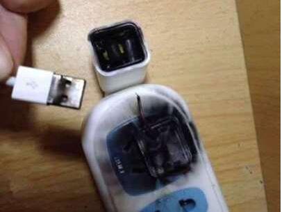 2016年7月,湖南一小區居民家中,客廳插座上兩個多月未拔的充電器發生故障導致火災,屋主和女兒均被燒傷。