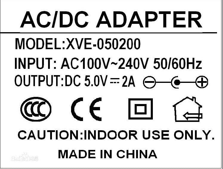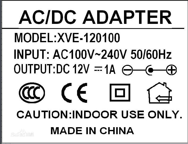 如圖所示,在電源適配器(下面稱adapter)的標簽上面一般會有幾項是需要注意的。第一,是adapter的型號,例如這顆adapter的型號是XVE-120100,它告訴了我們幾個信息,就是它的廠商、主要參數等,XVE開頭的一般就是##公司代號,120100就是說明這個adapter是12W的,050200的就是10W的;第二就是adapter的INPUT(輸入),在中國通用的一般是100-240V~50-60Hz,這說明這個adapter可以在100V-240V的電壓下面正常工作;第三就是adapter的OUTPUT(輸出),兩個數字可以很快速的算出這個adapter的瓦數,例如這個adapter,電壓12V*電流1A=12W(功率),說明這個電源就是12W的adapter。