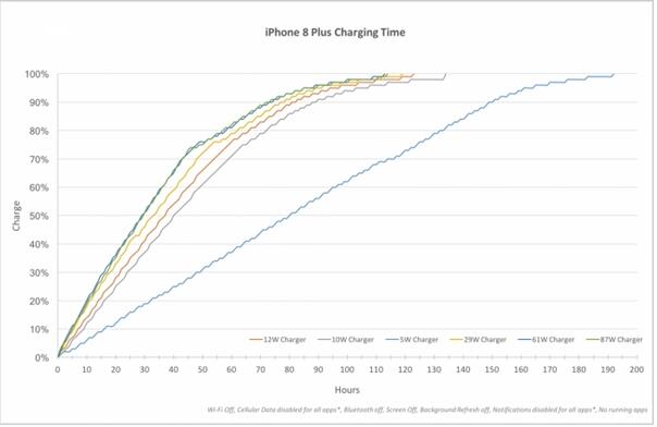 國外網(wǎng)友Dan Loewenherz,用iPhone 8 Plus做了一個充電器測試,從圖表上看來,如果用戶使用10W的充電器,絕對是性價比最高。