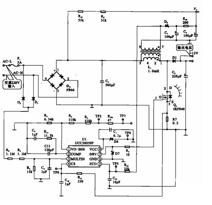 筆記本電腦的電源適配器電路,交流220 V電壓經(jīng)整流濾波電路后輸出+300 V直流電壓,再經(jīng)開關振蕩電路Ul (UCC38050P)、開關管控制、變壓器Li變壓、次級整流濾波后輸出+12V的直流電壓。