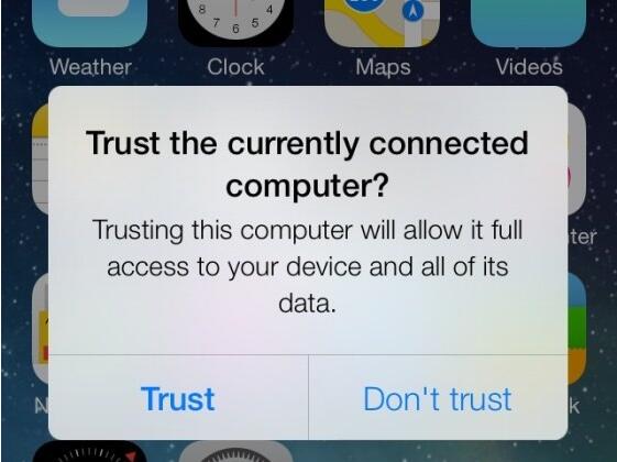 如圖所示,在新版iOS 7中當你連接數據線之后你還需要手工進行點擊來確保設備所連接的充電器是否是可信的,如果你在連接到充電器之后跳出這個信息,你可能需要考慮使用新的充電插頭了。