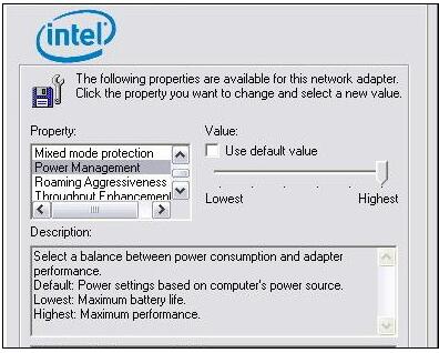 這是一些非常有趣的觀點。因此,我認為至少應該舉一個例子,如何進行無線網絡的省電設置。下面的圖片是英特爾無線客戶端應用程序下,適配器設置的情況: