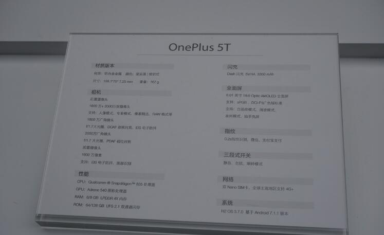 OnePlus 5T的配置表,7.25mm超薄加上162g的重量,是所有同類產品中最輕最薄的選手。