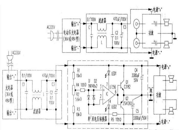 用充電器作電源,只需挑選充電器的輸出電壓(36與48V型)接近所采用功放的電源電壓值,按上圖方式連接使用即可。圖中除充電器與功放外,兩者間加入的L、C1~C3等元件環節。