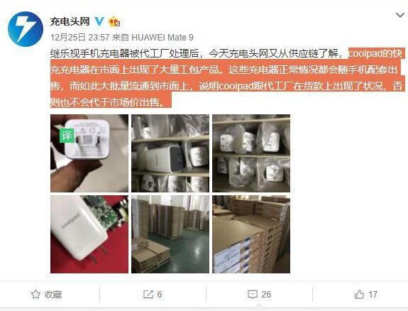 充電頭網在微博的消息稱,coolpad的快充充電器在市面上出現了大量工包產品。