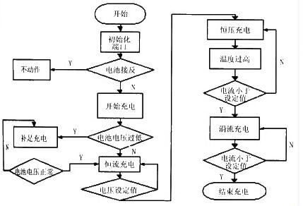 上電后,單片機首先檢查電池是否接反,電池電壓是否因為電而過低,如果電壓過低,先使用小電流給電池充電一間,使電壓達到三階段充電常水平在開始充電,如果電常則直接進入正常充電階首先是恒流充電階段,充電小于0.5 C,一般取0.1 C,電壓會緩慢的上升,當電壓到一定階段(本例中采用電60V)改為恒壓充電,此時隨電過程的進行電池內阻會逐升,充電電流會隨著內阻的而減小,當單片機檢測電流減小到一定的值(小于恒流充電值的1/1 0),立即轉入涓流充電階段,充電電流一般取0.3C,在此階段電池電壓會減小,當充電電流小于0.0 1 C時即可認為電池已充滿,單片機會自動將電池從充電電路中切除。在恒壓階段如果單片機檢測到電池溫度高于45度則自動轉入第三階段,待溫度下降后再轉入第二階段。充滿后通過單片機關斷繼電器,停止充電.。